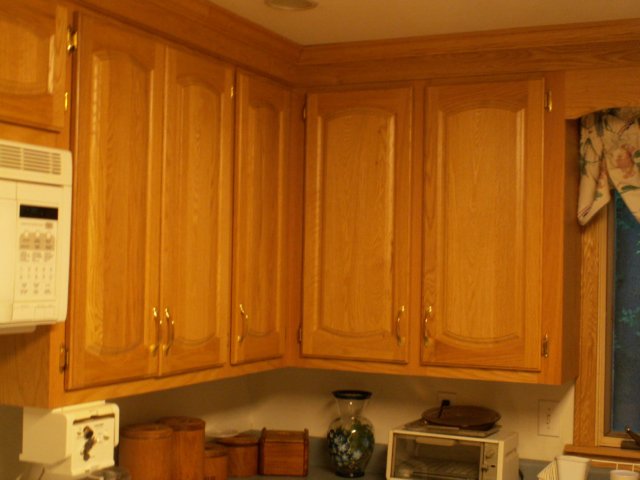 ![]() When we moved in all of the cabinets were very dark brown with plywood doors. So I made all new doors. |