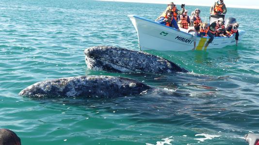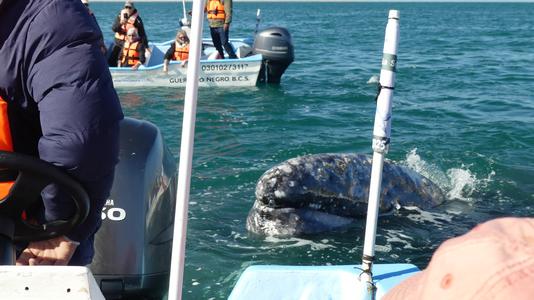 | This is our first day of whale watching here. We had to go through the salt flats, This area is a huge producer of salt. 90% is used commercially and the rest used in Mexico. Went whale watching at a UNESCO site (Mario's Tours). Watched a short video. About half an hour ride through town and by the salt fields to the boat dock. Had to motor to mouth of the lagoon in order to see the whales who stay in this area to mate and have babies. It was a beautiful sunny day and the whales came right around us and to the boats we were in. I was able to touch the whales 3 times. It was exciting and awesome to be so close to them. Walked around a few shops with Dawn, Lindsay and Robin. Margheritas at night at Mario's restaurant and almost everyone showed up a few at a time. Sam/Shel/Avi went to Tony's for dinner. Wonderful day all around. |