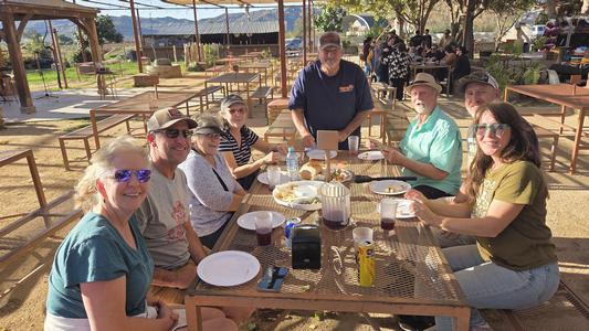 | We finally crossed the border, we are officailly in Mexico. While waiting to go through customs a semi with 2 trailers cut into or rather through the line to get to s side entrance. It was a close call. Once we settled in at the campground, we were escorted to a wine tasting at one winery snd then visited another for wine tasting and snacks. A bunch of us gathered at our camper and chatted until dark. |