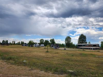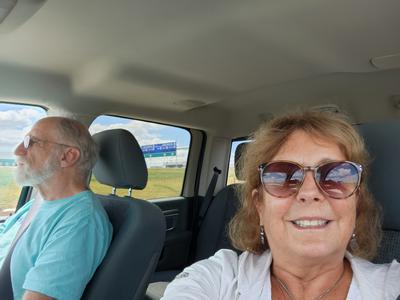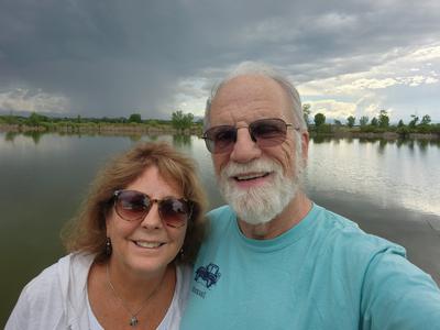 | Geni has arrived!! I messed up and thought she was coming in on Delta at 11:14 but in fact she came in on United at 12:27, so I spent an extra hour in the cell phone lot. She finally found me and we then went out for lunch and came back to the campground. Great having her here. I did the first leg of this trip, 2622 miles alone. Geni: Plane ride was uneventful and got here safely. But Denver airport is so big. From the time I got off the plane to finally meeting up with Shel, it took 35 minutes. I had to walk, take a train between terminals, go on moving walkways, go up and down escalators and an elevator. I confess that I did get lost when I finally found the exit to the terminal and it was for limos, taxis, buses. I had to ask someone where to go for people pick up and for that I had to take an elevator down (or maybe up -- I was confused by then). Denver is NOT Logan. And Denver is not Boston. You look around and see a big sky with clouds almost touching the ground.