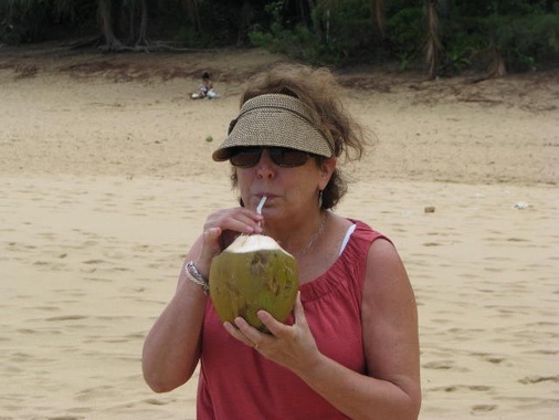 | Today we drove around the east end of the island to the north, and then as far west as we could go. The road is a little windy and narrow in places with some one lane bridges. On the north shore, we stopped and got some fresh coconut milk and then ate the coconut meat. It seems that a younger coconut is good for the milk, which we wanted to try, but the coconut meat is kind of rubbery. | |||