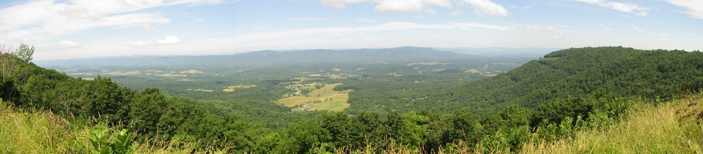 We saw a bear today!! Our first bear!! It was a baby bear and caught us so off guard as we were driving to the Visitor's Center. It actually posed for a moment, however, I couldn't get the camera ready in time and the first picture is of baby bear running away.It was an exciting start, but except for a few deer, that was it for the wildlife. It was beautiful weather and the views were impressive along the Skyline Drive. There are so many places to stop and catch the view (75 places), however, after a while, the breathtaking views become repetitive, so we started to skip 60 or so!! We did a couple of hikes (.9 miles and 1.2 miles) to see some nice views. It's still not tourist season, so no crowds to fight! (If you want to see any panoramic pics that Shel put together, just double click on them - different views from different locations) |