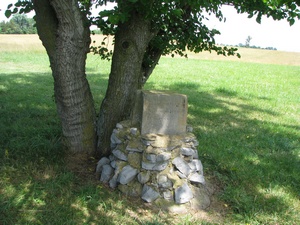 Monument to fallen soldiers at side of farm |