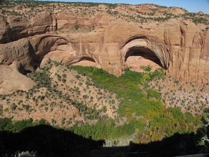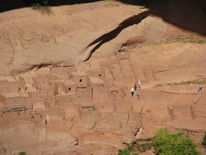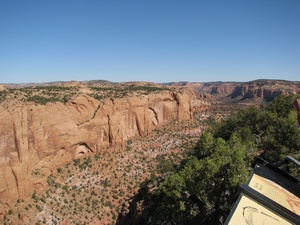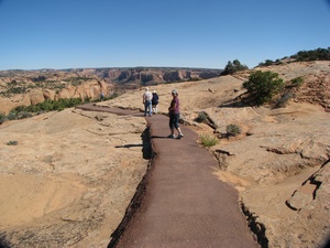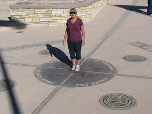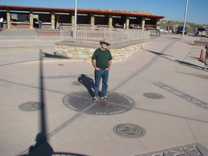 Today was a travelling day. We took off early and went to the Tusayan Ruin where there were prehistoric ruins of Pueblo inhabitants. It was early, so we didn't get into the museum, but saw the ruins. There was a sign there that said: Don't harm the snakes!! What??? The sign said those snakes were harmless and did provide a service eating the highly populated rodents. Luckily, I did not see any of these snakes - harmless or not! Then we went to the Watchtower where you could see, once more, the grand canyon. We saw 4 tour buses when we pulled up and there were lots of foreign tourists there. We did not hear anyone speaking english, but did hear german, maybe dutch, and french. We said goodby to the grand canyon and headed to Four Corners. We stopped at the Navaho National Monument where we saw ruins of cliff dwellers. Again, the trail was hours long and very steep, so we took the easy trail that overlooked it all. Then off to Four Corners Monument where the four states meet in one spot. The states are Colorado, Utah, Arizona and New Mexico. I thought it would be a lovely spot on a mountaintop, however, it was a drive up a long road that led to a dusty dirt filled parking lot. There was a courtyard with the designated spot available for pictures and booths manned by native americans selling their wares. It was under construction, so perhaps in the future, it will be more inviting. The spot itself was impressive, though. We got to the campsite by 5:30 and we will see what mesa verde is all about tomorrow.