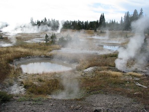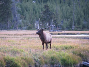 Today we did about 2 days of sightseeing in one day. We tried to see the highlights of yellowstone and was on the road from 8:00 AM and got back to the campground just before 6 PM! We had an interesting day. Mostly we saw lots of geysers that were real pretty colors but very stinky due to the sulphur and minerals. We did go to the Grand Canyon of Yellowstone Park and that was spectacular. The colors do not come out as vibrant in the photos, but it was a beautiful sight. We are now bison snobs -- we don't stop to look at one in the distance and get excited like we did yesterday-- we ran into them on the road today, so we have had our fill of bison. Also, the elk seem to have the run of wherever they want to be. We have a resident buck elk and three does in the campground. Tonight, people set up chairs and watched them from across the water, while the buck stared back at us. We seem to have no luck riding down the "designated" roads where we should find wild life, so still have not seen any bears or moose, although someone said the moose population left after fires during recent years. Besides the Grand Canyon's beautiful colors and waterfall, I liked the Norris Basin geysers, because there were a couple that actually spouted water like Old Faithful. We talked to people from Revere and also bumped into a young couple from Atlanta that we had met yesterday at another site. Tonight, Shel went to the amphitheater (outside) and listened to the ranger talk about winter time at yellowstone and how the animals adapt. It was cold, even for him, but he found it interesting. We're on the road tomorrow.