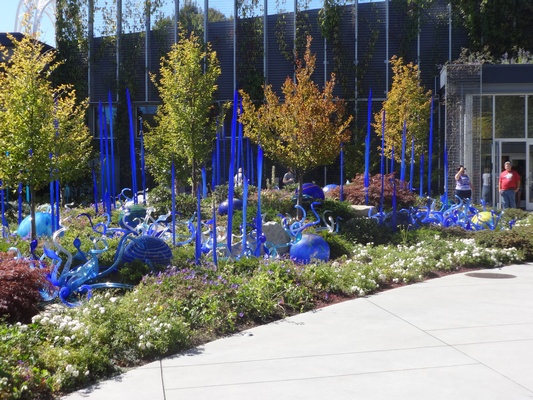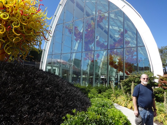 Shel: Well, I could say we got up and had an early start, but I'd be lying. We took a little side trip to a state park to view the petrified trees, started down the trails and Geni saw the rattle snake sign - she headed straight back to the truck :) We had to go through a couple of passes on the way to Seattle and ran low on gas. Stopped at a station that only had suprme at $4.40. To top that off the guy un front of us went in to shop while pumping gas and when he came out fiddled in his car until Geni went to ask if he could move :) Truck pulls really well! We set up camp in our friend's driveway. You know, the friends that went to Las Vegas when they heard us coming. Then headed into Seattle for some sightseeing. They have plenty of traffic here too! Geni: Thought we would go to Gingo Petrified Forest before we left for Seattle. Just a short ride from the campsite. No one was there, but we figured we would head down the path until I saw the sign below. I figured that since I didn't have boots on, only bare legs, there was no way I was going to hang around there. Shel's not a city guy -- driving to boston is not top on his list -- but the drive into Seattle went well. He even figured out a short cut to avoid traffic. We did the touristy stuff today. Nice hotel people let us park for free for a while to see the space needle and then we parked over at Pike's market place. Driving was very manageable in Seattle. Space Needle was fun to go to and see the city from so high up. We went to Chihuly's Glass Garden exhibit. I had seen an exhibit of his work in Boston at MOFA. It was spectacular. Then off to Pike's Place where we walked around. Like Fanueil Hall except this place is more a farmer's market with fresh fruit, vegetables and fish as well as the other little food/gift shops and food court. It was a fun place to walk around. Went out for dinner later and walked around waterfront. Fun night. |