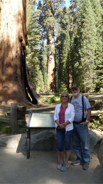 Today we toured Sequoia National Park. There are some really big trees here. It seems the redwoods grow taller and the Sequoias grow wider. The road up through the park was very winding and steep banks on one side and steep drops on the other. For those familiar with 'the road to Hanna', it is nothing like these roads. Geni: Once again, up a mountain to get to see the Sequoias. On the way up, it was most unsettling with all the zigzag turns. I think I've seen enough mountain roads. We did not explore the whole park and forest, but we did do a bit of walking and saw the Sherman Tree which is supposed to be the bigest tree in the world. The Sequoias are very resilient trees and can survive all kinds of disasters - fires, insects, weather. It is a very impressive story about how the park was protected from the tourism industry and how it is now preserved. |