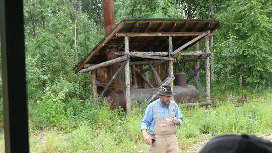 Shel: Got up to a rainy morning and headed off for a Gold Dredge Tour. It stopped raining by the time we got there. Nice little train ride where gold mining was described, then an explanation of how the gold dredge works and finally panning for gold. We all found gold ( not much, but we found gold). Then we went half way to Denali to a campground where we can charge stuff up and dump the tanks, Geni: Poured in morning, but luckily for us, it stopped raining and the day was great. Didn't know what to expect on this tour, but it was really fun. Train ride and explanation of how they mined for gold. We got to do it the old fashioned way with a pan and water. How they ever figured out how to mine the layers of dirt, tip the pan filled with water and dirt and end up with flecks of gold is just magical! In a very enjoyable presentation, they told how gold was found using early techniques and we saw the machines that were built early on. |