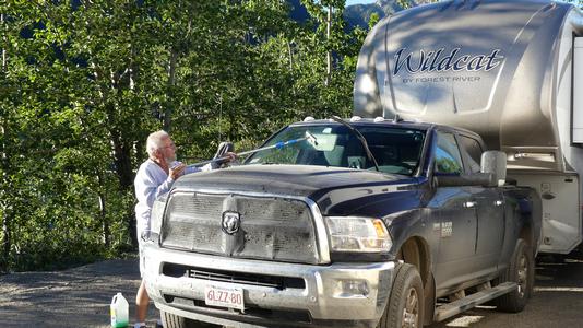 Shel: We finished our travels and ended in Stewart, BC , Hyder AK. Hyder is famous for its boardwalk where you can see bears catching fish. Well, not while we were there! The ranger said everything is late this year, the salmon runs and the bears aren't showing up due to the high temperatures. During our ride today we saw it high as 93F Geni: Last town to visit in Alaska and it did not go out with a bang! Was looking forward to seeiasng all the bears catching fish as we watched along the boardwalk. Didn't happen, although some people saw a bear and her cubs earlier. It's like fishing, except you are bear watching. You stand there and stare at the fish in the river and hope a bear appears. It was a long stretch getting here and it's not Alaska's finest area! We did catch a glimpse a couple of times of bears on the road. |