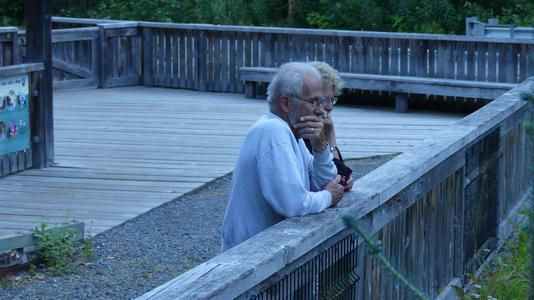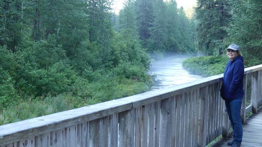Shel: Well, we left Alaska for the last time this morning. We started heading down toward Vancouver. Geni: Wanted to try fish preserve this morning to justify the long ride we took just to see bears eating fish. Last night people said they were there morning and evening for days until they finally saw a bear. None of us were willing to do that. . . and we never saw a bear for the hour we waited! Rangers say it's hotter than it's been in years and the bears probably would only show up in the evening, but both fish and bears have been scarce lately. Didn't mind leaving Hyder, which is a depressed and depressing town, and, Stewart was a level or two above it. But time to leave Alaska and back into civilization again. |