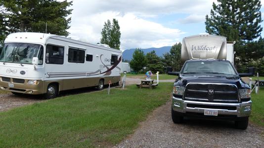 Shel: Another travel day, well over 400 miles. Managed to gas up before I was worried about not running out.. One tank full was about 6.1 MPG, we had a strong head wind and it was all up hill. After checking Google maps, it looked like there was only one private campground outside the East Gate so we went to the West gate, must have been an extra 90 miles and all down hill. The continuation of this trip called for us to go back past the East Gate and continue into Canada. Well, it is all up hill so instead of climbing it, we will try to go around. Geni: Today was a long day driving and when we saw the mountains of Glacier National Park we were really happy. However, it took over an hour and a half, -- passing by so many other campgrounds and roads that would never end -- to get here. Now we look forward to tomorrow to find out what exactly we will be able to see. Part of the park roads are still closed due to snow and also it may rain. But, it will be fun to begin exploring. |