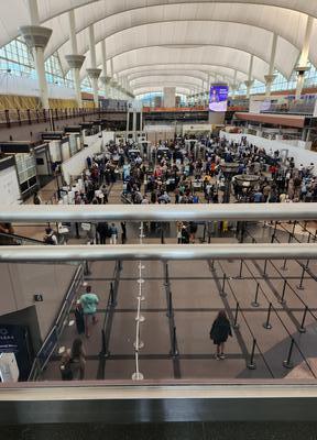 | Geni has arrived!! I messed up and thought she was coming in on Delta at 11:14 but in fact she came in on United at 12:27, so I spent an extra hour in the cell phone lot. She finally found me and we then went out for lunch and came back to the campground. Great having her here. I did the first leg of this trip, 2622 miles alone. Geni: Plane ride was uneventful and got here safely. But Denver airport is so big. From the time I got off the plane to finally meeting up with Shel, it took 35 minutes. I had to walk, take a train between terminals, go on moving walkways, go up and down escalators and an elevator. I confess that I did get lost when I finally found the exit to the terminal and it was for limos, taxis, buses. I had to ask someone where to go for people pick up and for that I had to take an elevator down (or maybe up -- I was confused by then). Denver is NOT Logan. And Denver is not Boston. You look around and see a big sky with clouds almost touching the ground.