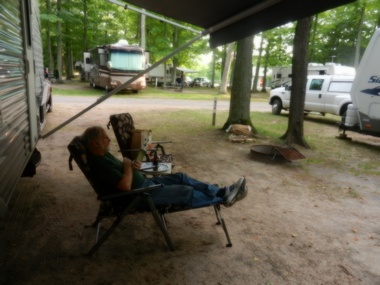 | Geni: Took us all day to get to Sleeping Bear Dunes. The GPS took us a round about way which made it even longer. Got to see a bit of Lake Michigan which was such a pretty color blue. We left before 9, spent about 1/2 hour at customs waiting to go through and then didn't get here until 4ish. The campsite is really nice. We are looking forward to checking out some sights tomorrow. It seems that Good Morning America rated this lakeshore as the Most Beuatiful Place in America. Caught Shel in various activities!! |