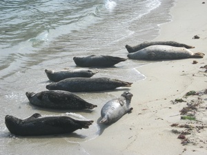 We met up with Barbara and Fernando. Geni and Barbara went for a walk along the beach while I went off and did some electronics shopping. Want to make the reading lights better. When I got back, we went to check out their condo, tour through Seacoast Village, and then went for some beers at the Hotel Del Coronado. Went out for Tai food and headed back to the camper to rest. Geni: Day started out gloomy but sun came out for most of the day. Got to see where Barbara lives in La Jolla. We walked along the beach and saw the seals sunning themselves at the beach. Later, we went to their new place in downtown San Diego. We also went to where the Midway Ship was and some monuments to the Greatest Generation.