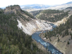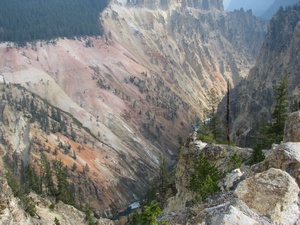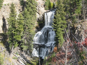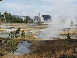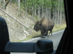 Today we did about 2 days of sightseeing in one day. We tried to see the highlights of yellowstone and was on the road from 8:00 AM and got back to the campground just before 6 PM! We had an interesting day. Mostly we saw lots of geysers that were real pretty colors but very stinky due to the sulphur and minerals. We did go to the Grand Canyon of Yellowstone Park and that was spectacular. The colors do not come out as vibrant in the photos, but it was a beautiful sight. We are now bison snobs -- we don't stop to look at one in the distance and get excited like we did yesterday-- we ran into them on the road today, so we have had our fill of bison. Also, the elk seem to have the run of wherever they want to be. We have a resident buck elk and three does in the campground. Tonight, people set up chairs and watched them from across the water, while the buck stared back at us. We seem to have no luck riding down the "designated" roads where we should find wild life, so still have not seen any bears or moose, although someone said the moose population left after fires during recent years. Besides the Grand Canyon's beautiful colors and waterfall, I liked the Norris Basin geysers, because there were a couple that actually spouted water like Old Faithful. We talked to people from Revere and also bumped into a young couple from Atlanta that we had met yesterday at another site. Tonight, Shel went to the amphitheater (outside) and listened to the ranger talk about winter time at yellowstone and how the animals adapt. It was cold, even for him, but he found it interesting. We're on the road tomorrow.