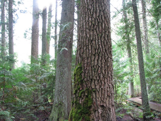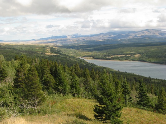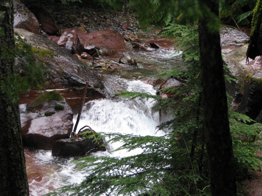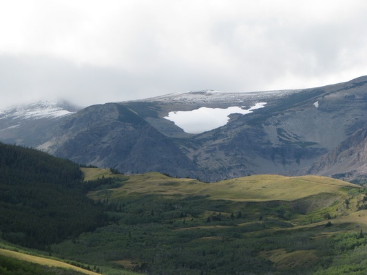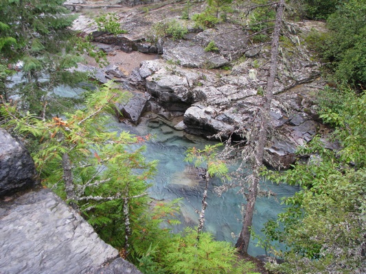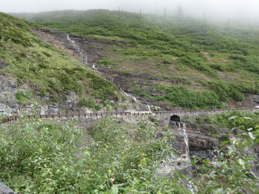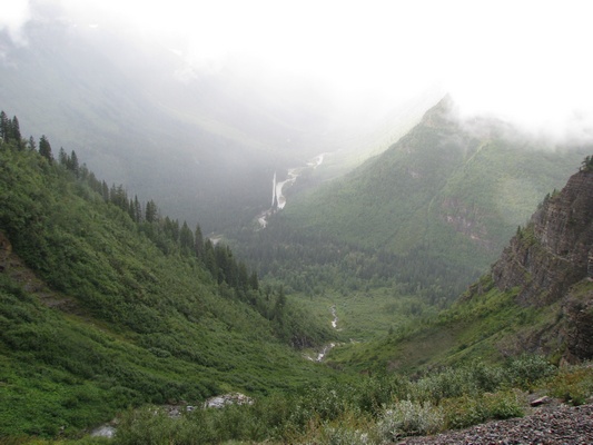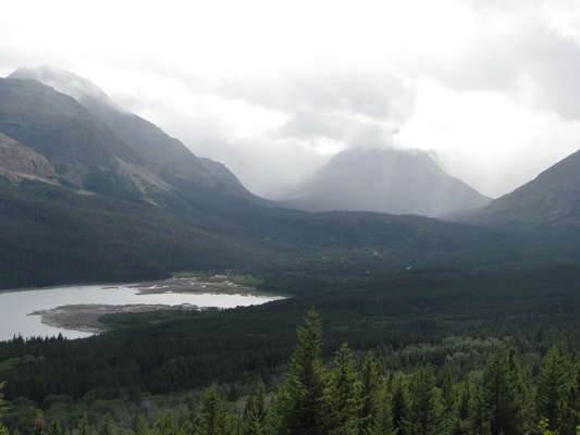 Shel: We rode around the park for over 200 miles - Truck did well, 14.9 MPG, oh wait - no trailer :) Going-To-The-Sun-Road was narrow and scary at times, a rock wall on one side and a cliff on the other. As per usual we ran into construction and had to wait in a couple of places. Geni: In all our travels, this was the first day that it rained on our vacation. We drove the 50 mile Going to the Sun Road and stopped at different spots. We spent about 8 hours walking and driving in and out of the rain and into occasional sun, depending upon whether we were on the east glacier side or the west glacier side. The views were spectacular and the photos can't compare. We saw glaciers on the mountain tops, saw streams andwaterfalls and we were literally in the clouds. We ran into some Rhodes Scholars at the Avalanche Creek and walked with them for a while so we could hear what their guide was saying. They are a national organization on a ten day visit and the woman who started talking to me said she lived in Idaho but had gone to Wellesley College (small world). As per our luck, all the wildlife -- bears (thankfully not), mountain goats, and any living creatures were no where to be seen. Only saw cattle and horses. |