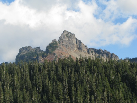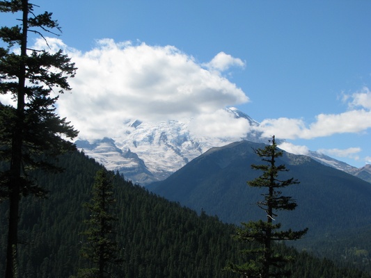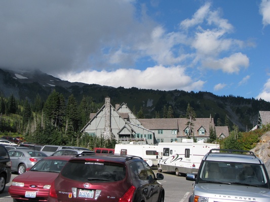 Shel: We had a relatively uneventful trip from Okympic National Park to Mount Rainier National Park. Got here and the top of the mountain was stuck in the clouds. We were a little low on gas so decided to go into town to get gas. Town is 28 miles away and 3000' lower in elevation! Geni: These parks are getting larger with miles to go from place to place. We drove up the mountain to get to the campsite, down the mountain to get gas, up a different side to drive up to the highest visitor's center, and looped through mountian roads to get to other sites. Shel drove from Olympic National Park to here -- we got here around 12:30 - ate lunch and then took off and didn't get back to almost 8 p.m. He amazes me that he just keeps trucking along - he drove over 300 miles all together. |