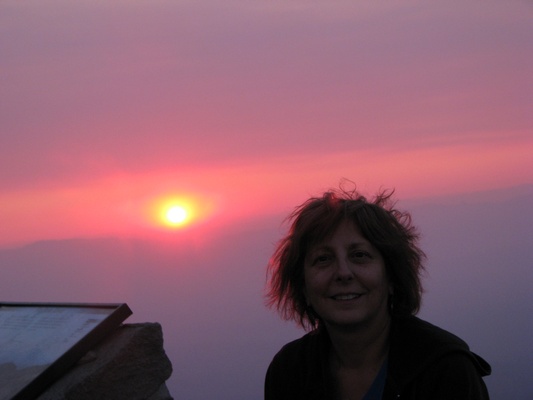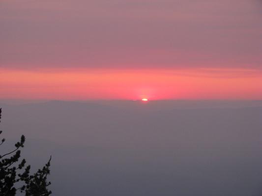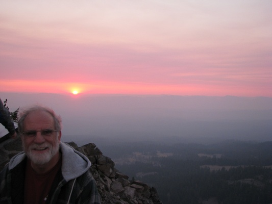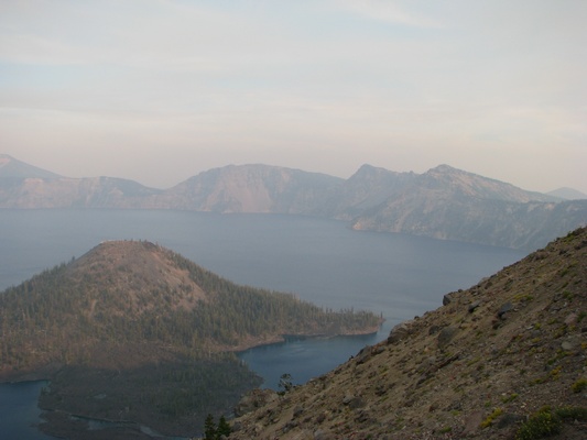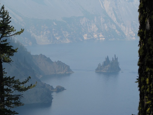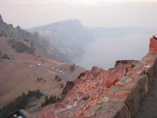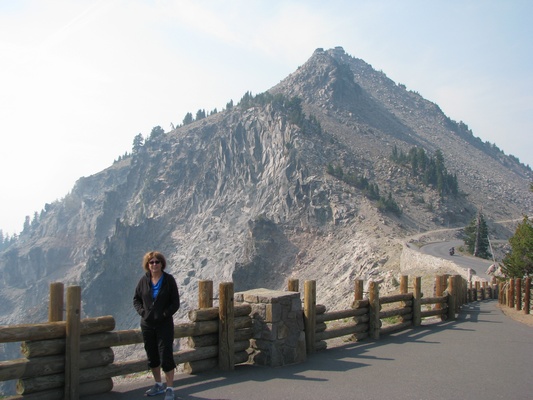 Shel: The campground is at about 6000' and 7 miles away from the Rim Drive. Rim Drive is not as scary when you don't have a camper behind you!. It's a light day with only about 100 miles being logged. Tomorrow we're off to Redwood State and National Parks in Northern California. Today our sightseeing was in elevations of 7000 to over 8000 feet. The lake was socked in by smoke from fires to the south of us. Geni: Disappointed to find the clear skies of yesterday were not to be today, although by evening, the view looked better. We rode around to lots of sites and saw a movie that explained how the top of the volcano collapsed and over many centuries the water filled into what is now crater lake. They said the water is pristine because the lake is not fed by any streams or rivers, only by rain and snow. Crater Lake is the deepest lake in America. There is enough water in the lake to provide 700 gallons of water to every person in the world. We went on an sunset hike led by a ranger. We didn't realize the .8 mile hike was going up the side of a mountain. We made it to the top where there was a watchtower and saw the sun set over the cascades mountains. We were over 8,000 feet above sea level. |