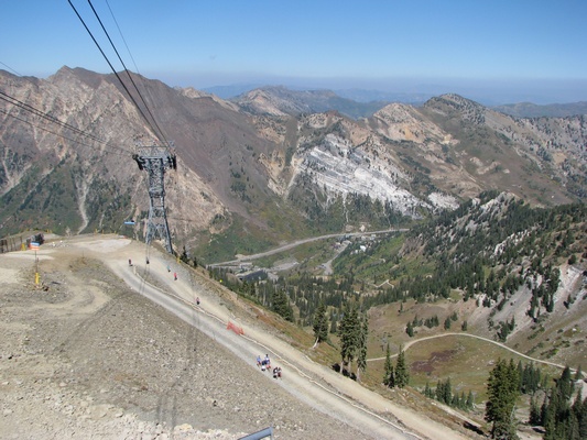Shel: Another great day, met up with Dan and Michelle for Breakfast, a quick tour of SLC and then up to Snow Basin for Octoberfest! Took the tram up to the top of the mountain - view was spectacular and I can't believe that people ski down from the top. Geni: So nice of Dan and Michelle to bring us up to Snow Basin where they were having an Octoberfest which lasts from now until mid-october! Took a tram ride up to 11,000 feet. Overcast skies, but that didn't dampen the day. There are so many places in this area for skiing, mountain biking and hiking. We took a drive by of Salt Lake City on our way to the mountains. All the buildings had beautiful rooms to see, but we didn't want to spend time touring them. This is a panoramic view from the top of Hidden Peak |