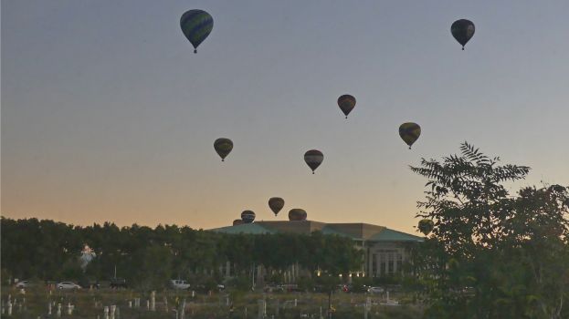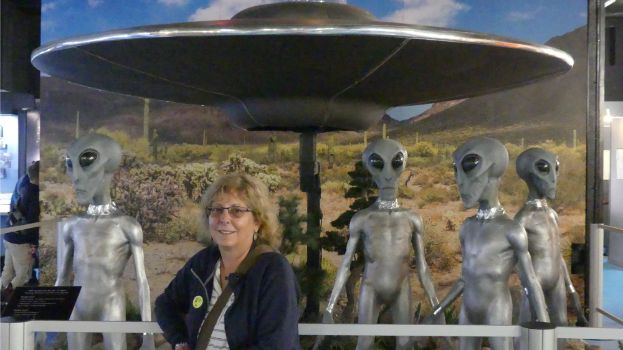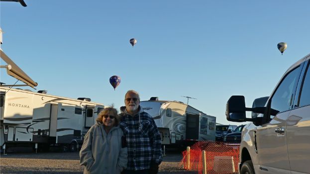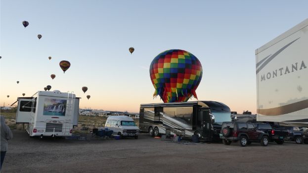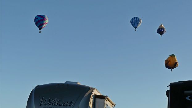 We left Albuquerque after we got a glimps of the morning balloons. On the way down to Carlsbad we stopped in Roswell, NM which is famous for the UFO crash there. We then continued on to the KOA in Carlsbad. Had to get gas along the way, found a station and this is the first time I've had to back out of a gas station! Gas is more reasonable here, about 2.50 for 88 octane. We went into the park to see the bats fly out of the cave. We were a little early so took a 9.5 mile scenic ( dirt ) road. Got to the bat cave right on time. Nice talk by the ranger, but it seems it was too cold for many of the bats to fly out. Geni: Got up and ready to leave but we were entranced by the balloons once again. This time they were coming towards our campground, so we got a different perspective. We pulled ourselves away and left for Roswell. Once again, the roads were long, flat, straight and had pretty much nothing between Albuquerqe area and Roswell. The same was true from Roswell to Carlsbad. Visited the Roswell Museum that showed documentation that the UFO crash was real. They also documented how it could not be real, so nothing new. Lots to read and we just couldn't keep up. Got to campground and then to Carlsbad to see bats leave the cave. Because it is cold and late in the season, the bats have either left or just didn't want to come out in droves. After the informative ranger talk, everyone pretty much left. We are convinced we saw at least one little bat leave the cave! |