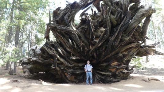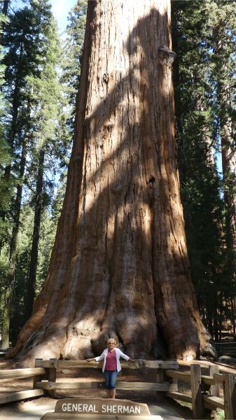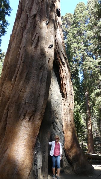 Today we toured Sequoia National Park. There are some really big trees here. It seems the redwoods grow taller and the Sequoias grow wider. The road up through the park was very winding and steep banks on one side and steep drops on the other. For those familiar with 'the road to Hanna', it is nothing like these roads. Geni: Once again, up a mountain to get to see the Sequoias. On the way up, it was most unsettling with all the zigzag turns. I think I've seen enough mountain roads. We did not explore the whole park and forest, but we did do a bit of walking and saw the Sherman Tree which is supposed to be the bigest tree in the world. The Sequoias are very resilient trees and can survive all kinds of disasters - fires, insects, weather. It is a very impressive story about how the park was protected from the tourism industry and how it is now preserved. |